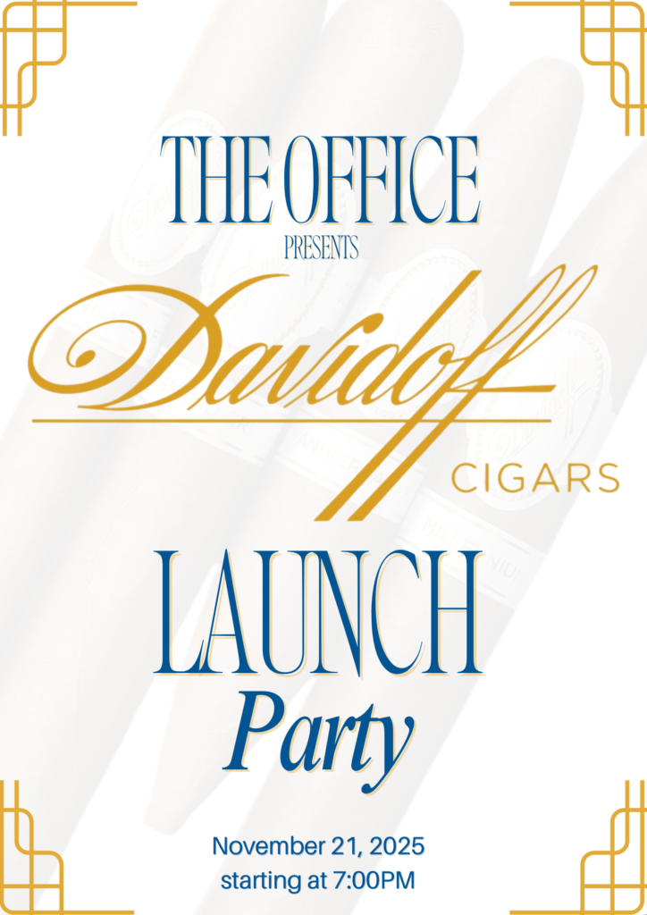 Join us for the Davidoff Launch Party at The Office Cigar Lounge, celebrating the debut of an exceptional company. Enjoy refined cigars, curated pairings, and an elevated lounge experience worthy of the Davidoff name.