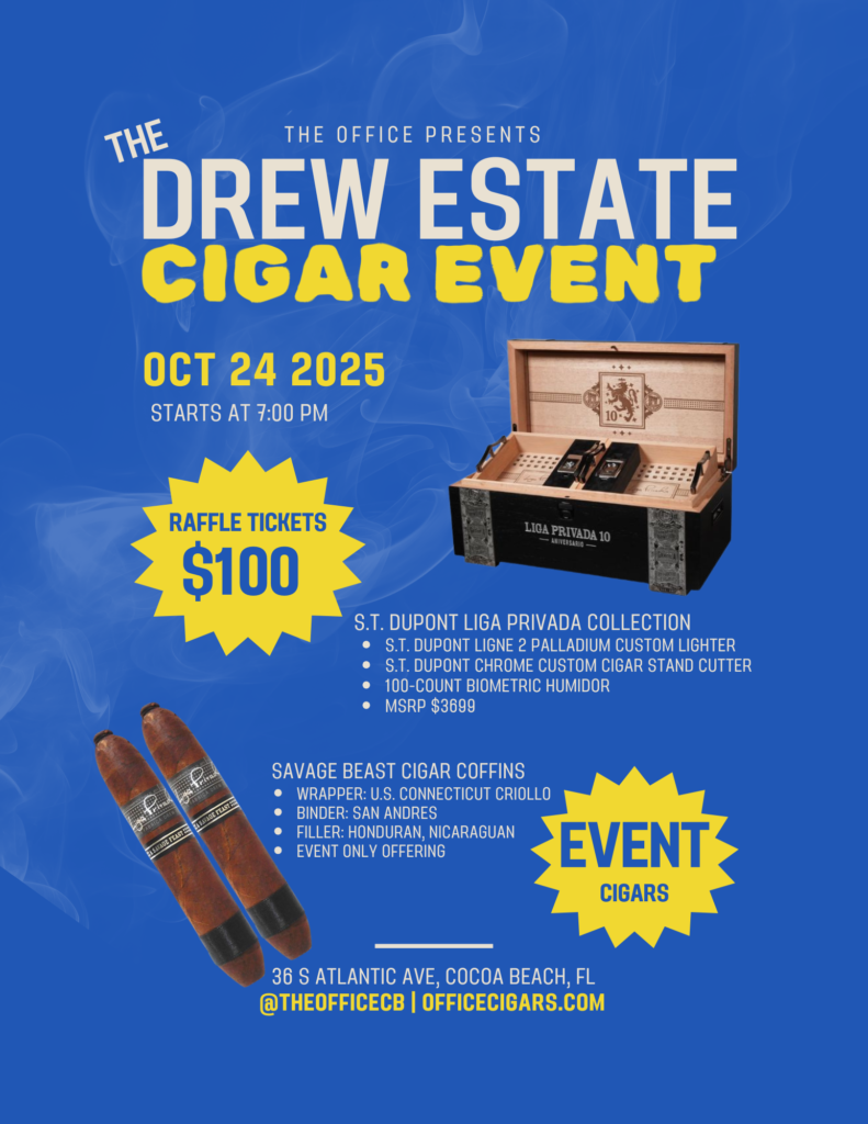 The Office Cigar Lounge in Cocoa Beach welcomes Drew Estate for an evening celebrating legendary cigars and craftsmanship. Enjoy featured blends, special raffles, and a relaxed yet upscale cigar experience.
